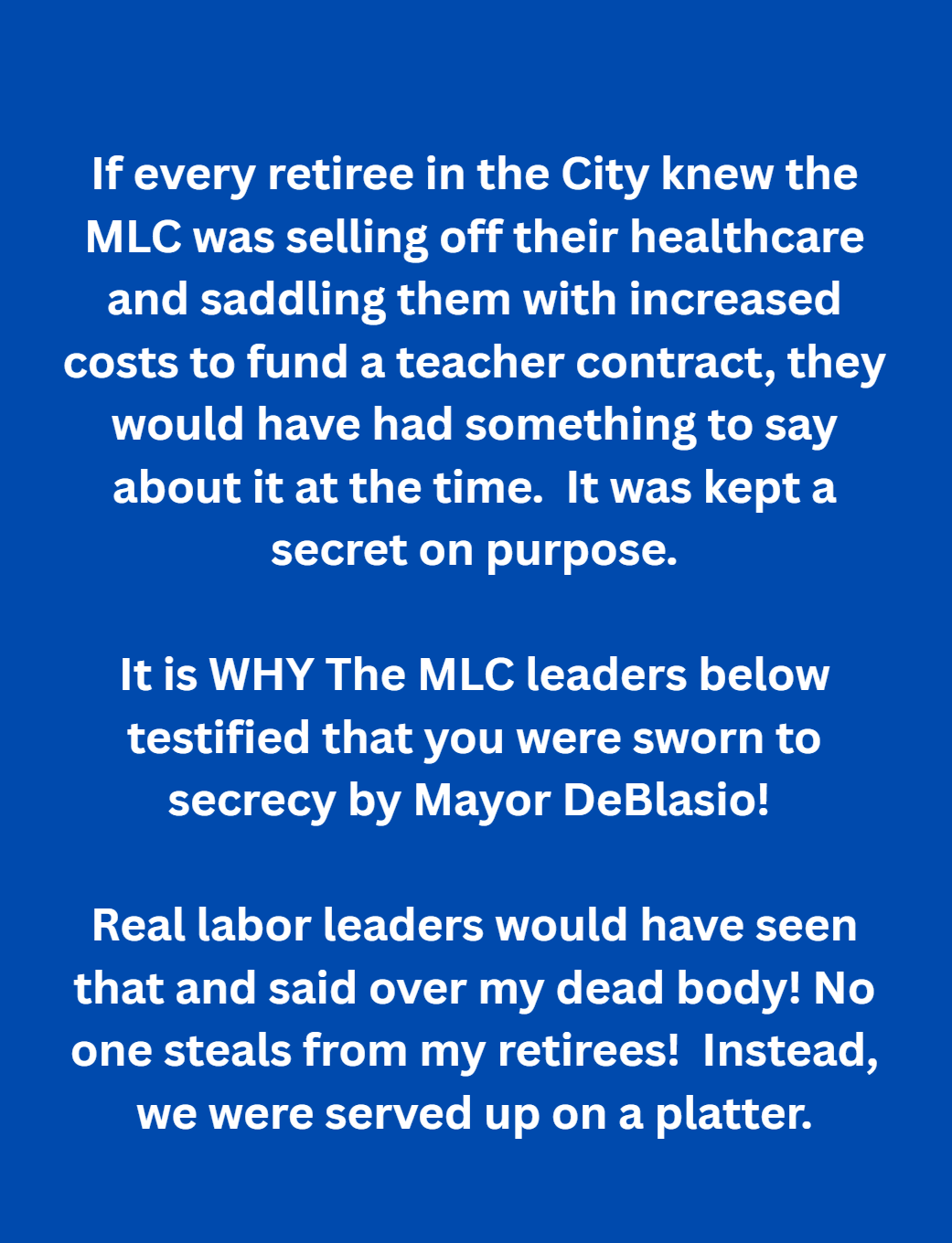 MLC testified at City Council that they couldn’t tell the retirees that they were changing their healthcare because DeBlasio wouldn’t let them. I remind you, healthcare for active workers must be jointly negotiated between the City and unions as per the 1992 MLC agreement. The MLC knew this because they sued Bloomberg for trying to initiate an RFP to replace their plan in 2014 without their knowledge, and a Court determined Bloomberg violated their agreements.